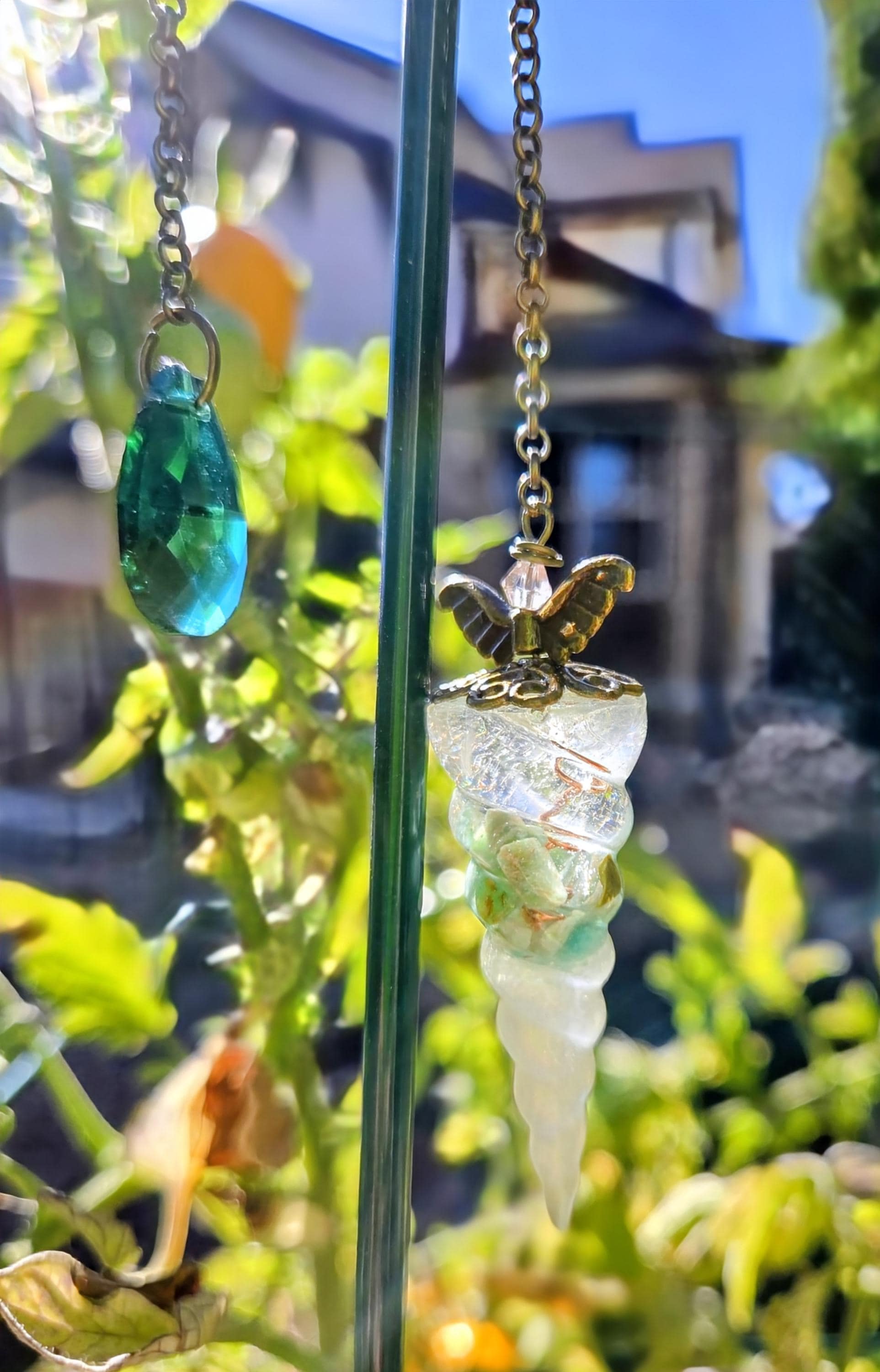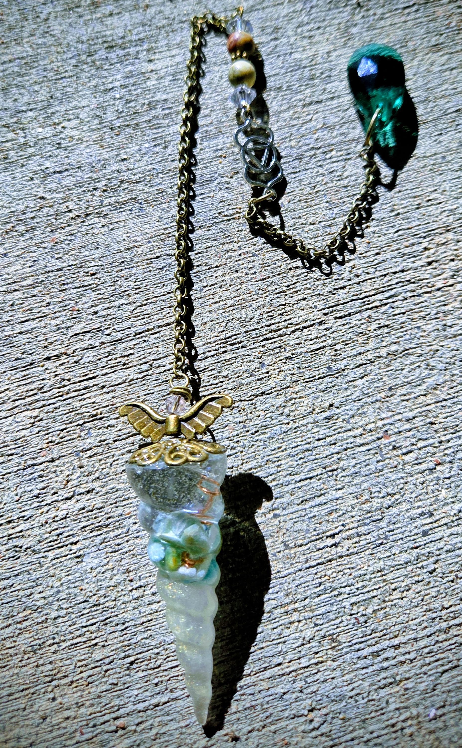 Bring a touch of magic to your spiritual practice with these handcrafted crystal-filled resin pendulums. Each piece features genuine crystals suspended in shimmering chameleon pigment resin, wrapped in a copper spiral to amplify and balance energy. No two are ever the same—each pendulum is infused with unique, metaphysical vibrations.