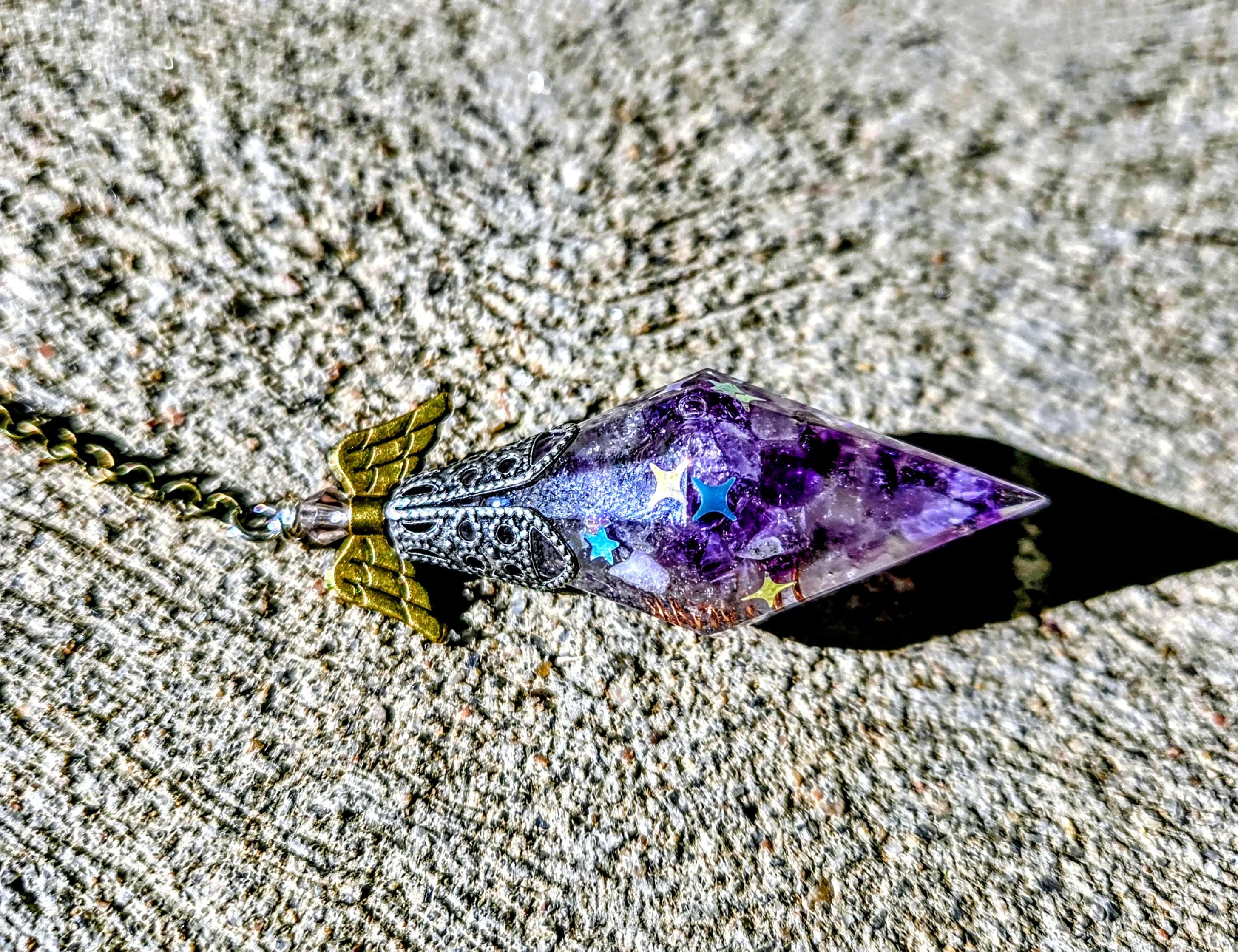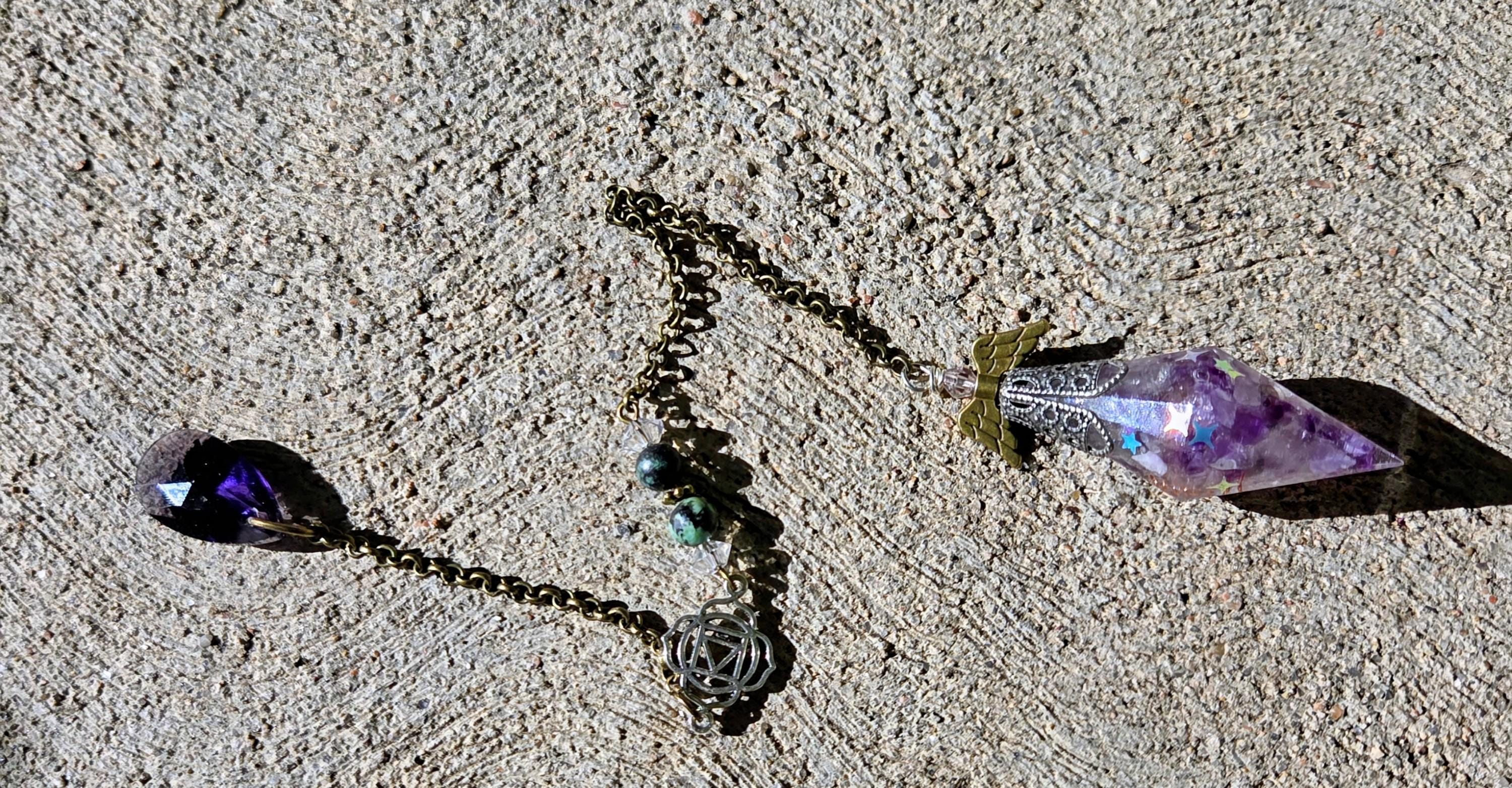 Bring a touch of magic to your spiritual practice with these handcrafted crystal-filled resin pendulums. Each piece features genuine crystals suspended in shimmering chameleon pigment resin, wrapped in a copper spiral to amplify and balance energy. No two are ever the same—each pendulum is infused with unique, metaphysical vibrations.